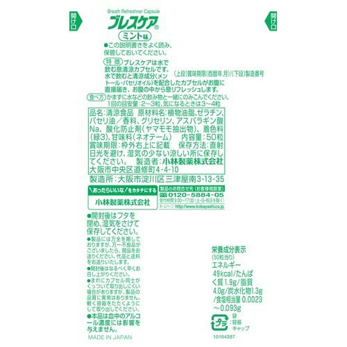 [Ingredients for Kobayashi Pharmaceutical Breath Care Mint] Vegetable oil, gelatin, parsley oil, fragrance, glycerin, Sodium Aspartate, antioxidant (Chinese bayberry extract), coloring agent (Green 3), sweetener (Neotame).